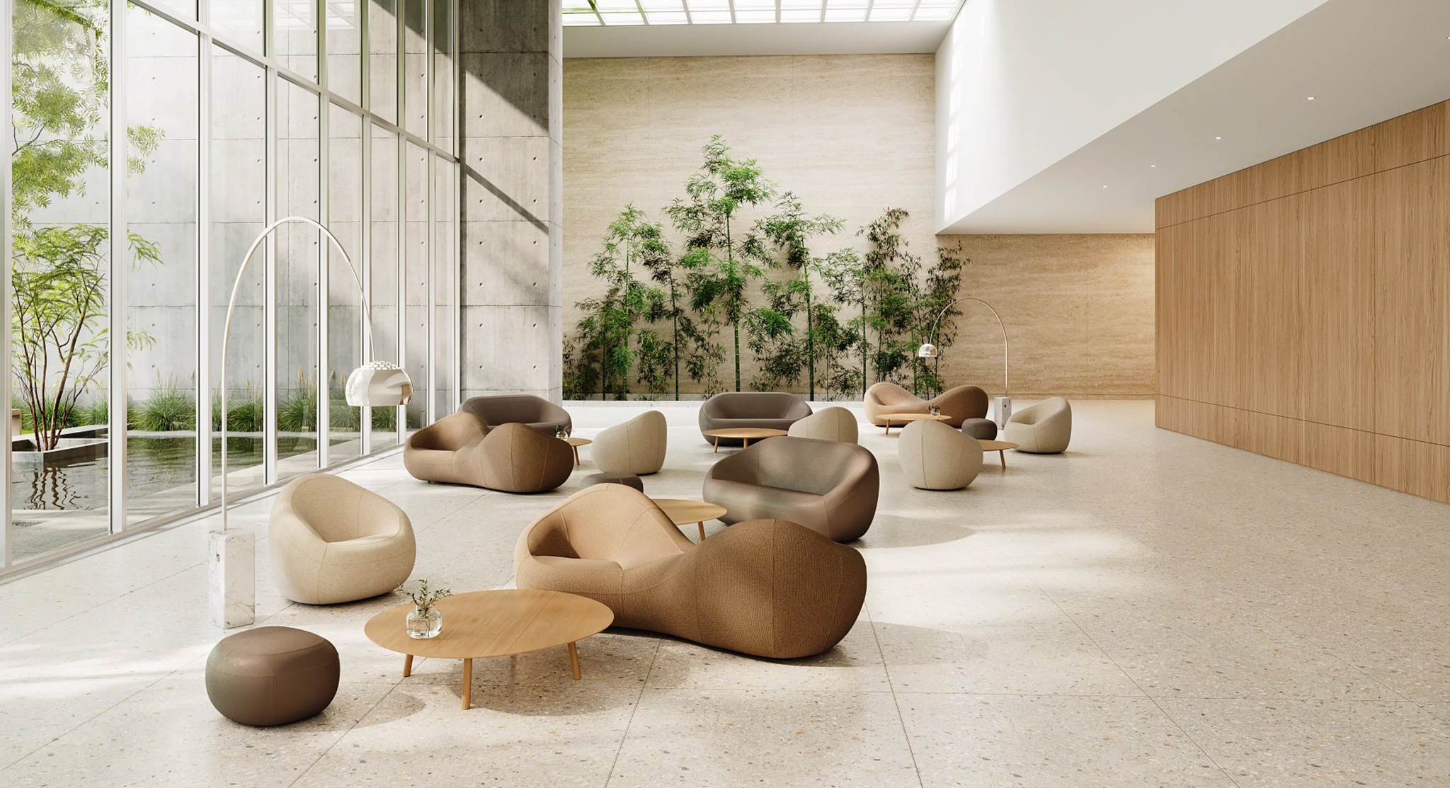 Chaque siège est une invitation à venir se détendre au creux d’une forme organique qui semble être un prolongement de votre corps. L'absence d'arrêtes saillantes offre un plus grand confort lorsque vous vous asseyez. Un véritable oasis au milieu de la foule.